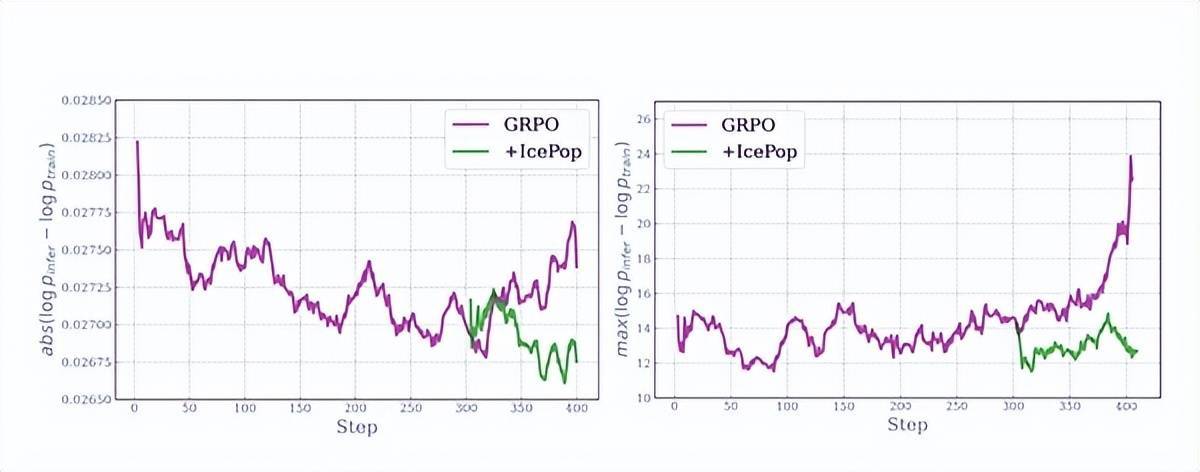 在Ring-1T模型中,蚂蚁采用了自研的“棒冰(icepop)”算法来应对这项行业难题,即用带掩码的双向截断技术把训练-推理分布差异冻结在低水位,确保长序列、长周期训练不崩。