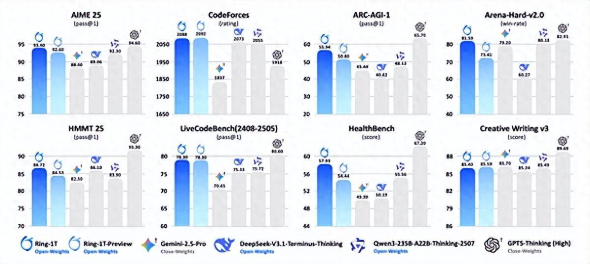 Ring-1T在9月30日开源的预览版Ring-1T-preview基础上,持续扩展大规模可验证奖励强化学习(RLVR)训练,进一步激发万亿基座的自然语言推理能力,并通过 RLHF 训练完善模型通用能力,在各项任务榜单上表现更加均衡。